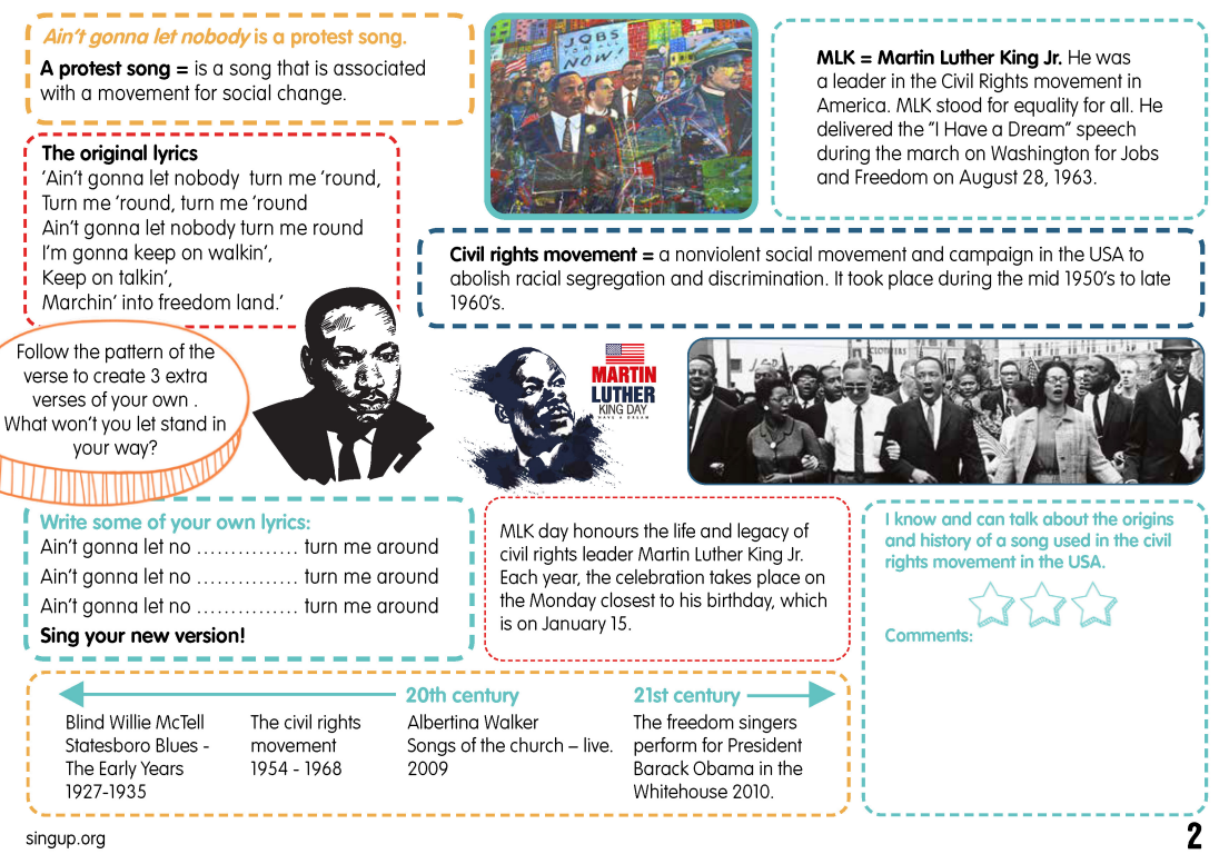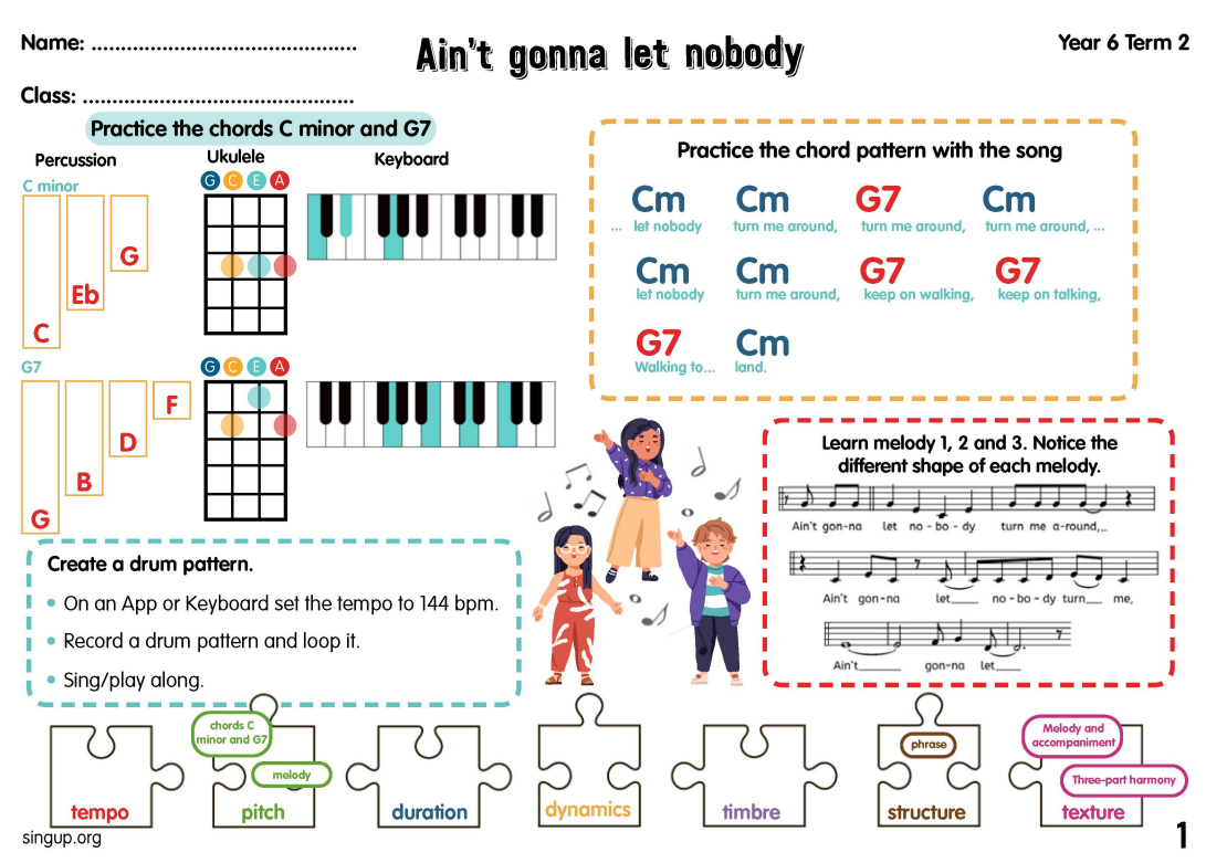 After half term, the class will explore a unit which features an R‘n’B-inspired arrangement of a traditional spiritual, sung in unison and three-part harmony. In addition to singing the song, comparing versions, writing new lyrics, and creating their own accompaniment ideas, pupils will learn about the social and historical context of the civil rights movement in the USA.