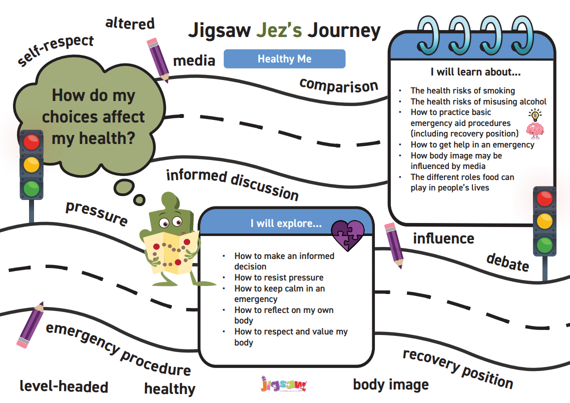 In the unit Healthy Me the children will learn about the health risks associated with smoking, vaping, and alcohol misuse, particularly regarding their effects on the heart, liver, and lungs. They gain practical life skills by learning basic emergency procedures, such as the recovery position and how to contact emergency services. The unit explores how media, social media, and celebrity culture influence body image and self-perception. Students develop strategies to resist peer pressure, make informed lifestyle decisions, and build the self-respect needed to value their own bodies for who they are.