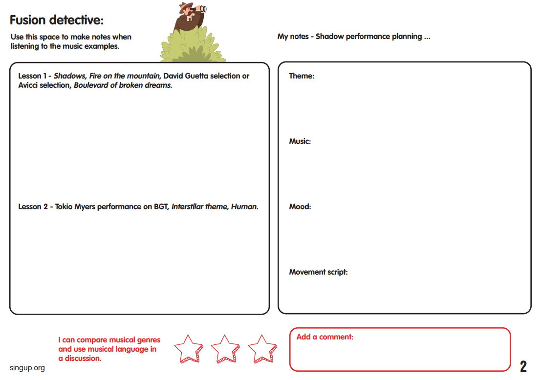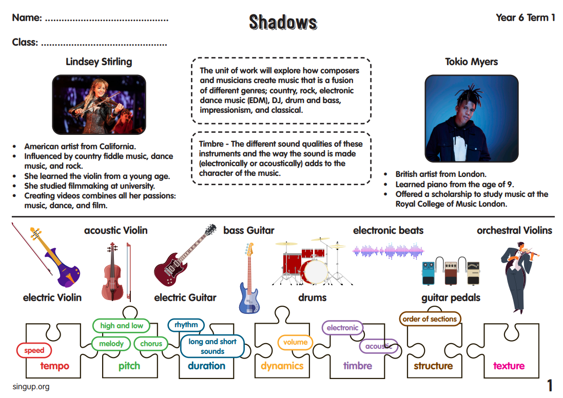 Class 4 start the term with a listening unit based around the piece Shadows by Lindsey Stirling – an American violinist and dancer. As an artist, she creates music that is a fusion of country, electronic dance music (EDM), and rock. There are lots of video examples to watch with focused questions to guide listening and base discussions around. Tokio Myers is also included in this unit as an artist who found fame on the TV programme Britain’s Got Talent. He studied classical piano at the Royal College of Music and uses his talents to create music that fuses many different genres. The unit ends with a creative response to music using shadows.